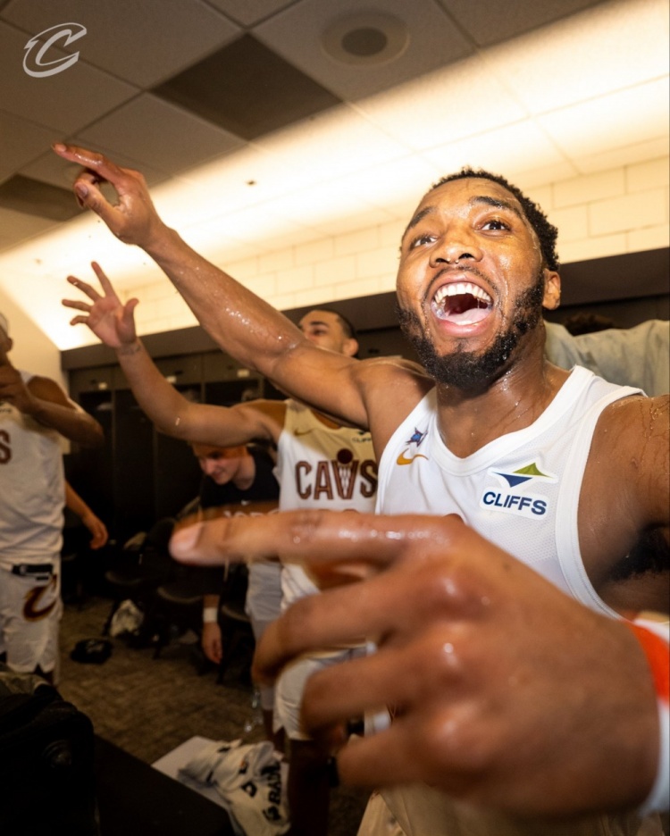 赛后骑士官方发布照片,球队在更衣室洒水庆祝阿伦打出生涯之夜的表现,他也获得了本场比赛的比赛用球。